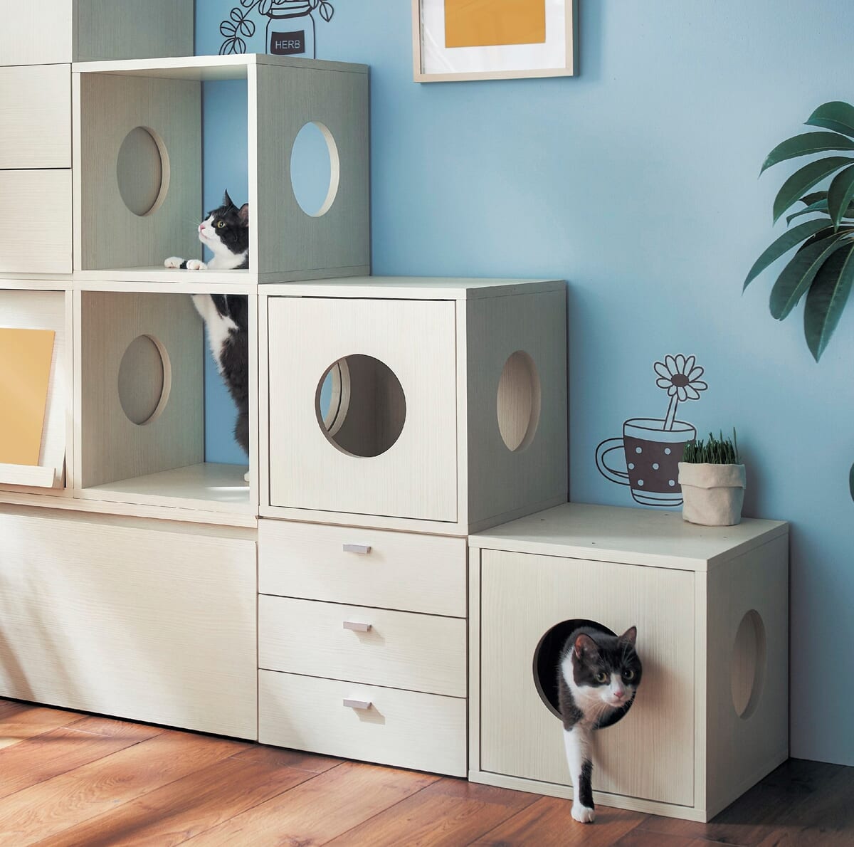 猫が通り抜けできる穴が開いており、キャットウォーク代わりにも休憩スペースにもなる収納家具です。