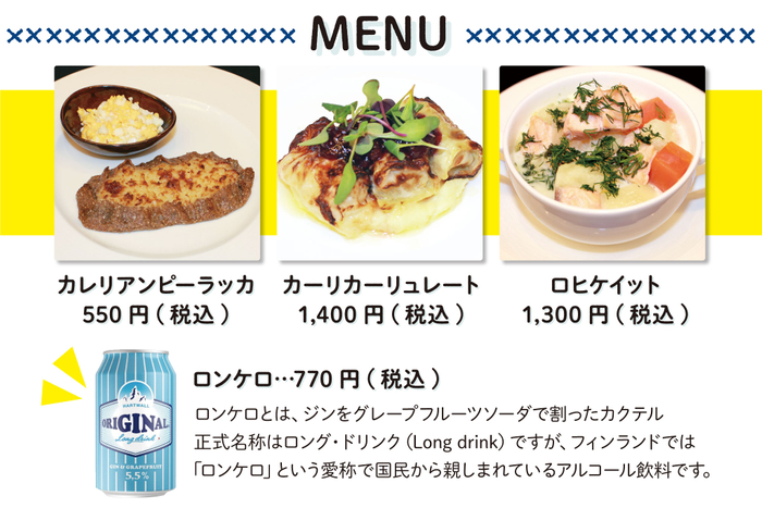 また、フィンランドメニューの他にフィンランドの国民的アルコール飲料「ロンケロ」も販売。