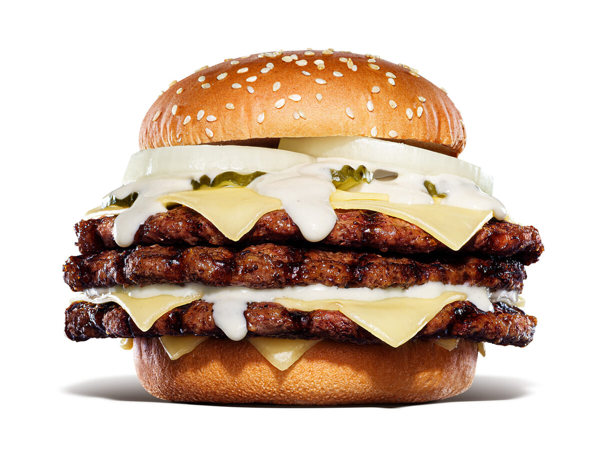 バーガーキング自慢の直火焼きの100%ビーフパティ3枚に、シャキシャキのオニオンと味のアクセントのピクルス、まろやかな味わいのゴーダチーズスライスを贅沢に6枚重ねたボリューミーなバーガー。