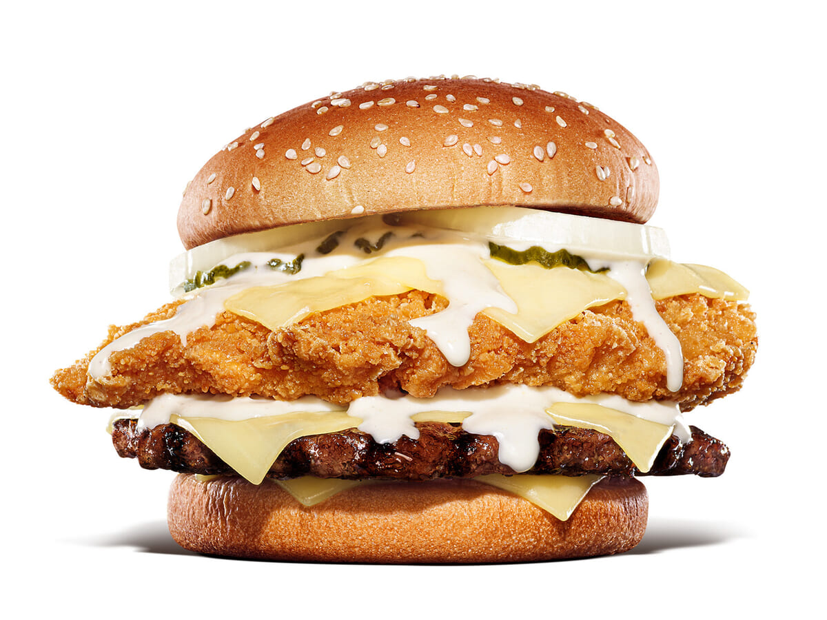 贅沢に6枚重ねたゴーダチーズスライス、たっぷりのホワイトチーズソースとの相性が抜群で、ビーフとチキンが1度に楽しめる贅沢な味わいに仕上げられています。