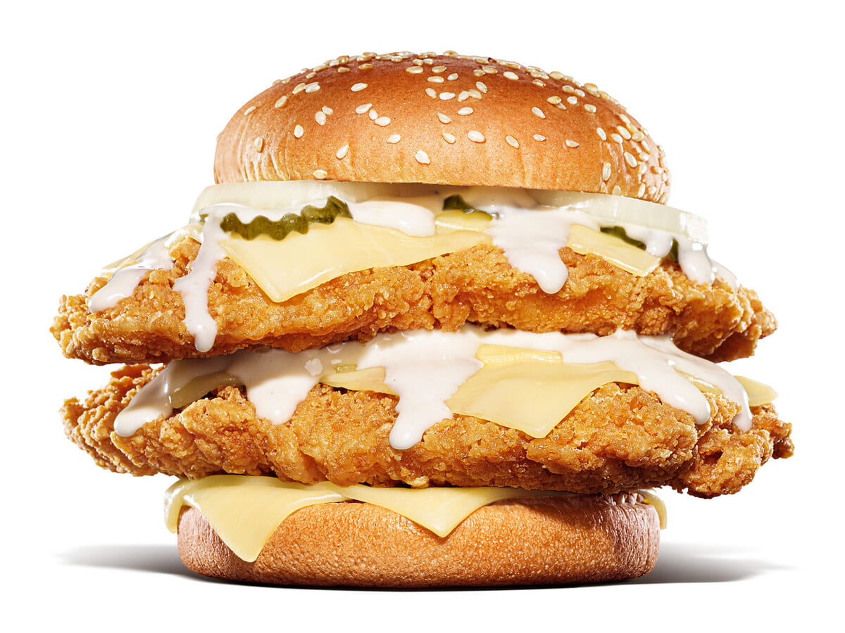 ジューシーでサクサクなチキンパティを豪快に重ねたダブルミートパティが楽しめる、味もサイズも別格の新作チーズバーガーです。