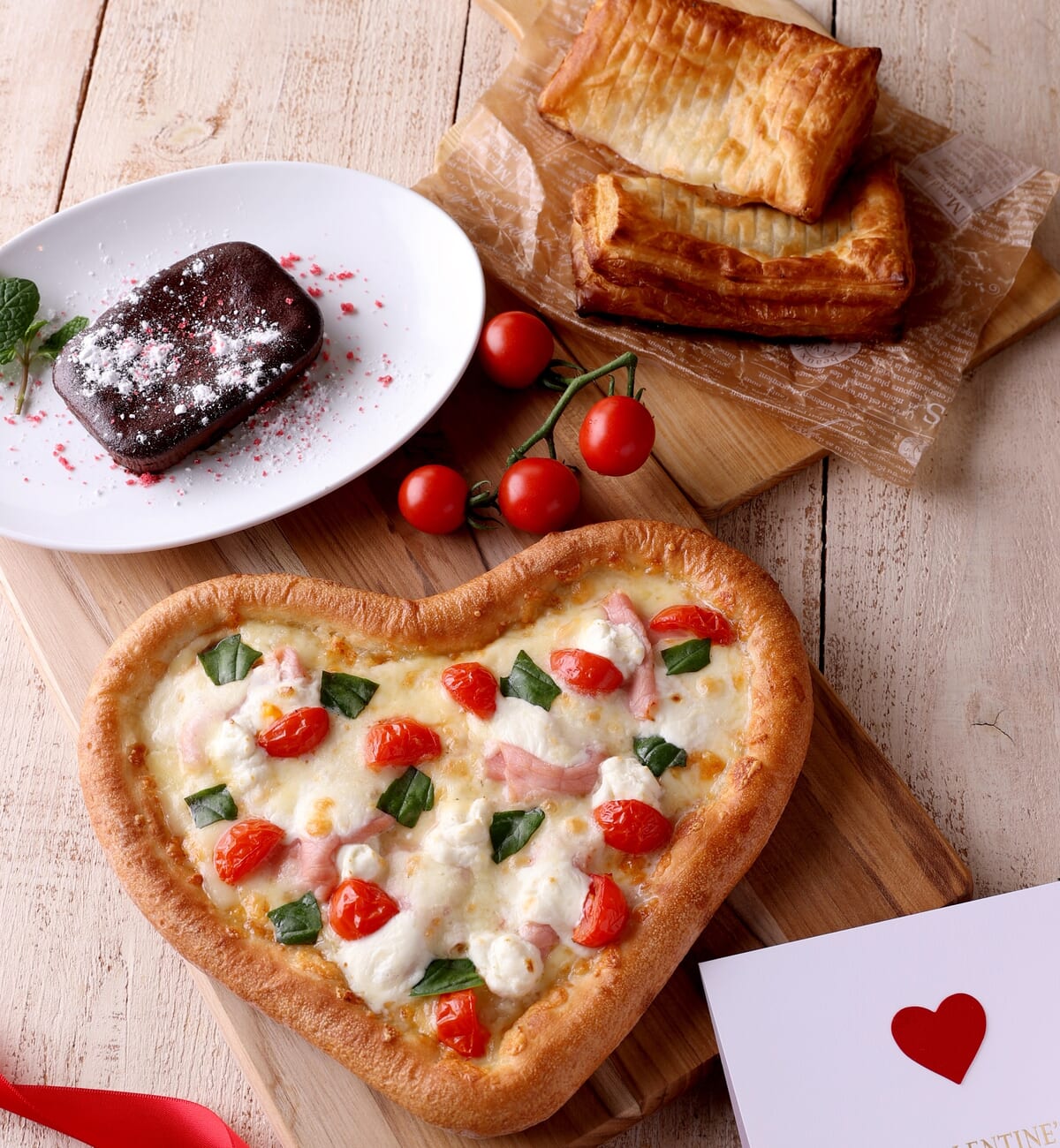 セット内容:ハートのマルゲリータ(1枚)、焼きたてフォンダンショコラ(1個)※通常価格500円(税込)、焼きたてアップルパイ(1個)※通常価格490円(税込)