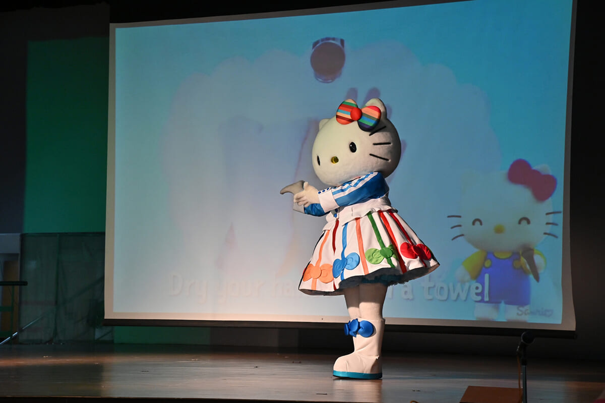 「ハローキティ」はみんなの前で、「Let's Wash Our Hands with HELLO KITTY!」の音楽に合わせて踊りながら、手洗いの8つのステップを実演しています。