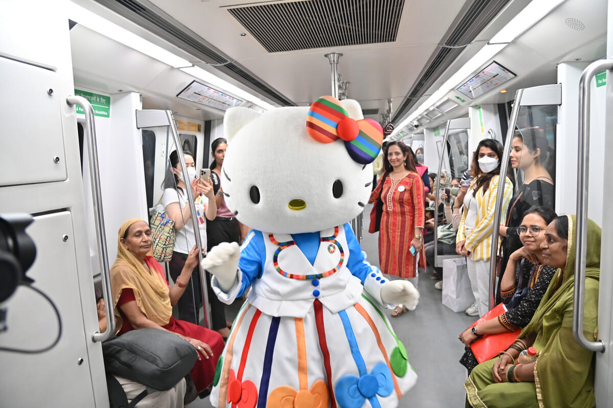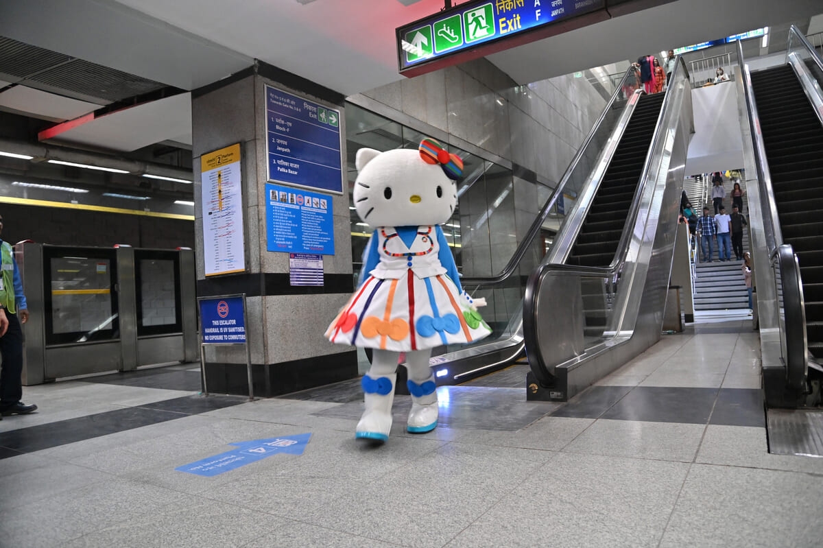 「ハローキティ」がデリーメトロのラジブ・チャウク駅からパテル・チャウク駅まで乗車し、女性専用車両への乗車を体験。
