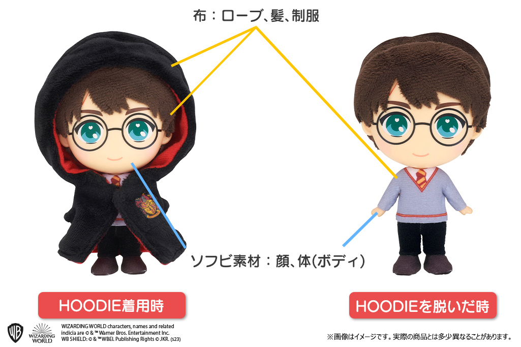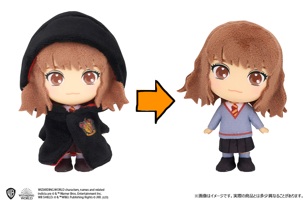 ソフトな触り心地で、ローブを着せるとキャラクターたちのフォルムもよりふんわりとしたかわいらしい印象になり、ローブを脱がせるとホグワーツ魔法魔術学校の制服姿になります。