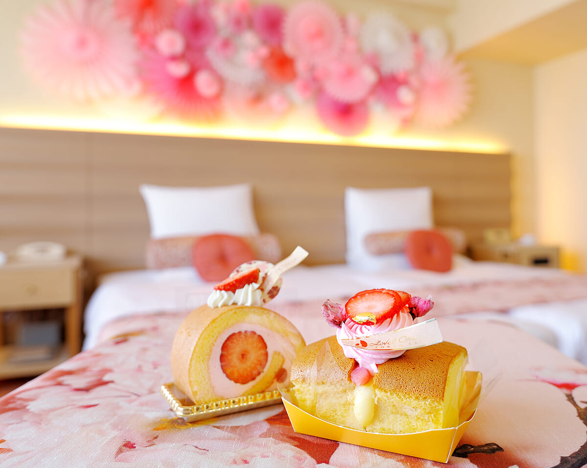 プラン内容:コンセプトルーム~SAKURA日和~、パティシエ特製桜スイーツ2種(1泊につきお1人様2個「台湾カステラ ~SAKURA~」「桜香るロールケーキ」)