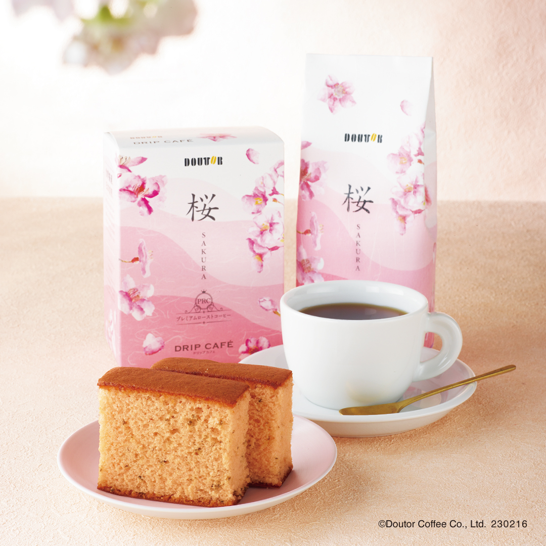 ドリップカフェ「プレミアムローストコーヒー桜」(5パック入り)と「桜カステラ ~桜はちみつ使用~」(5切れ入り)のお得なセット。