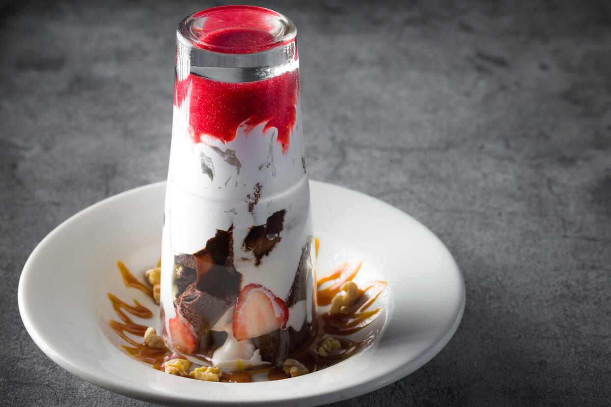グラスの中にイチゴピューレ・チョコソース・生クリーム・イチゴ・ブラウニーが入ったデザート。