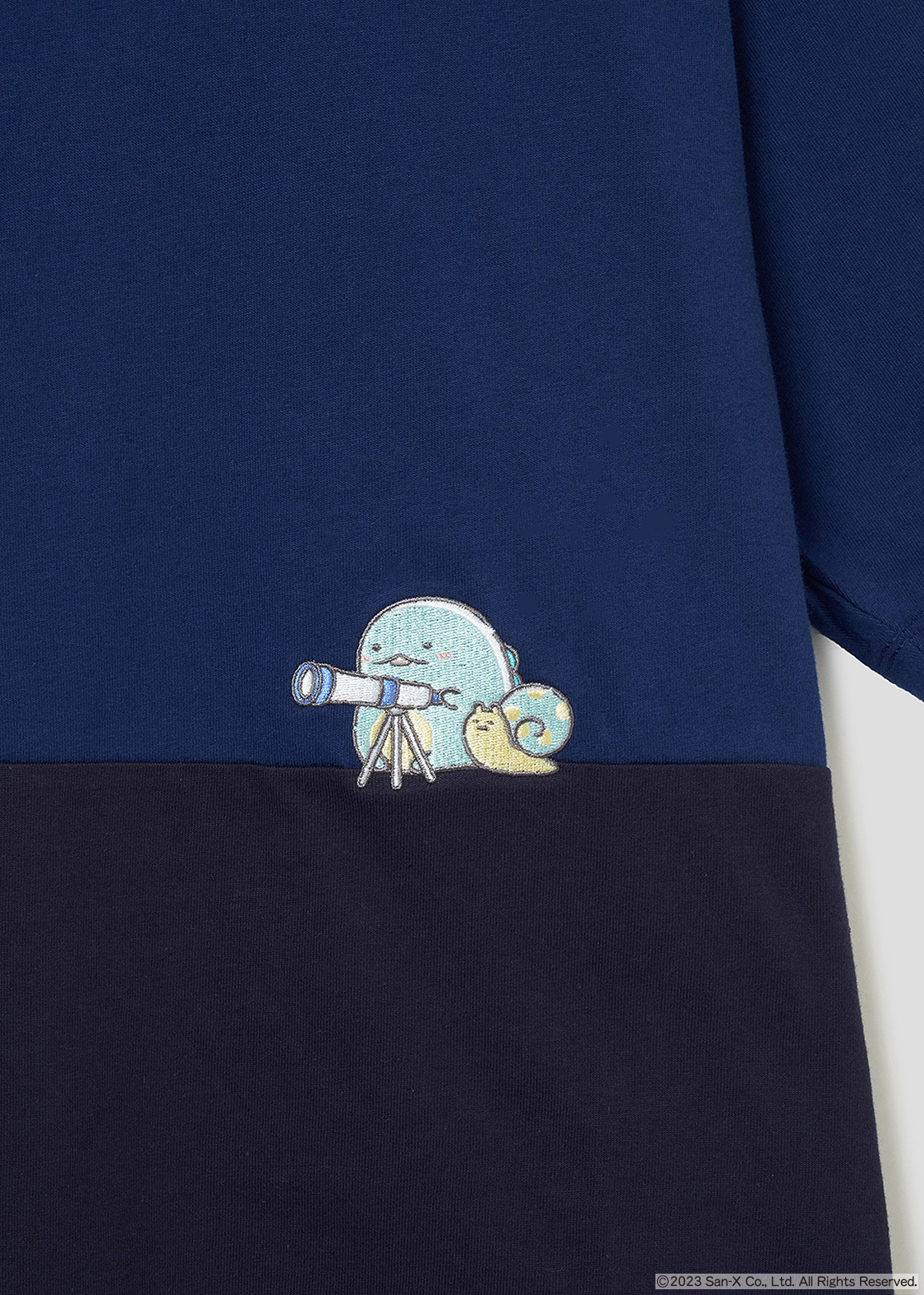 フロントの切り替え部分に星空を眺める「とかげ」と「にせつむり」が刺繍されたシンプルなデザイン。