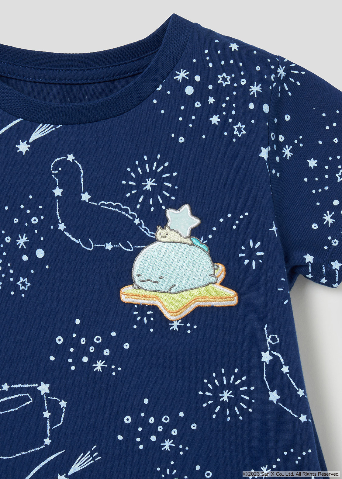 胸元には星に寝そべる「とかげ」と「にせつむり」が刺繍されています。
