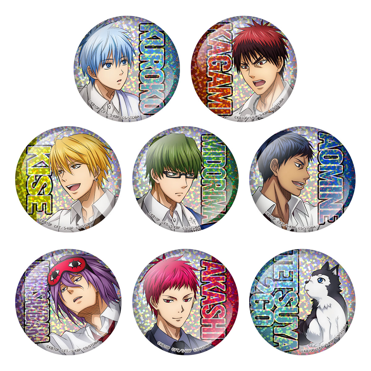 「黒子テツヤ」や「火神大我」など『黒子のバスケ』に登場するキャラクターたちがプリントされた缶バッジ。