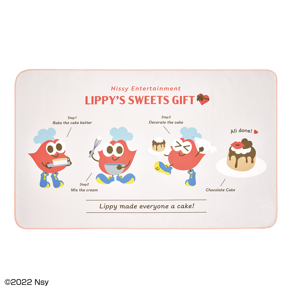 パティシエ姿のLippyがケーキを作る様子がデザインされた、マイクロファイバー生地の大きいタオル。