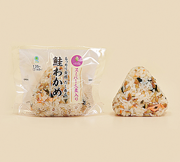 スーパー大麦に人気具材の鮭と相性の良いわかめを組み合わせたおむすび。