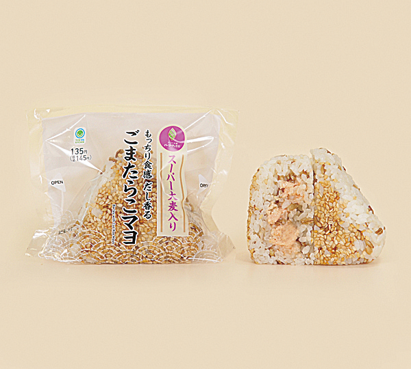 白だしで炊いたスーパー大麦ともち米入りのご飯で、たらこマヨネーズを包んだおむすび。