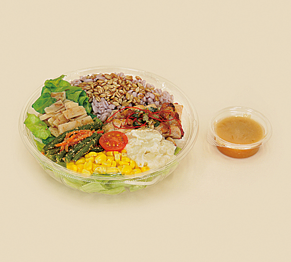 チキンとかぼちゃ、キャベツ、紫キャベツにスーパー大麦を加えて、シーザーソースと合わせたサラダラップ。