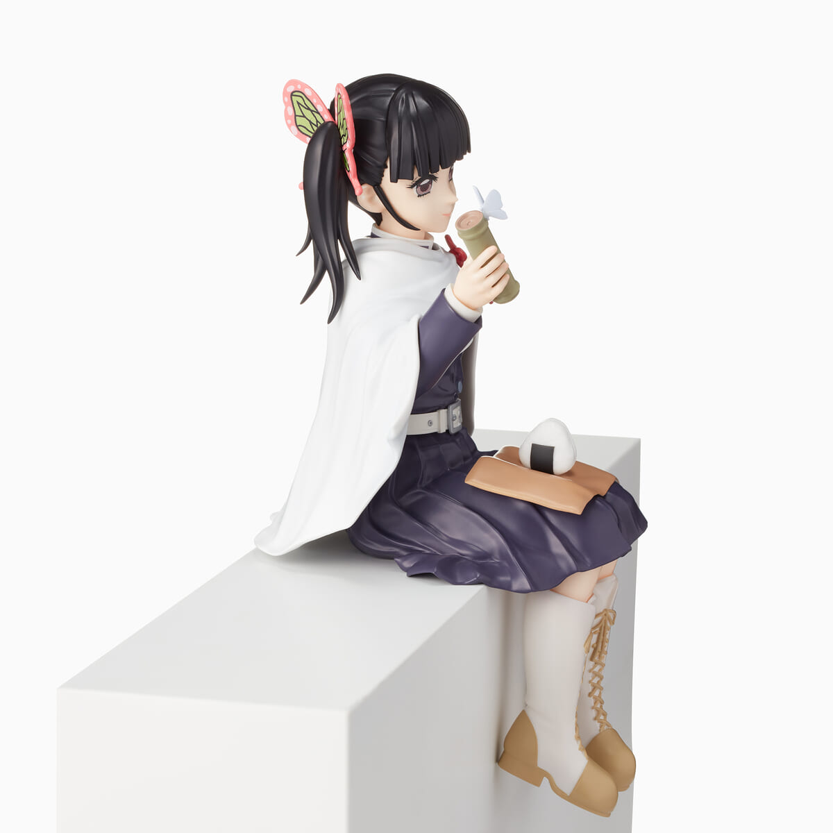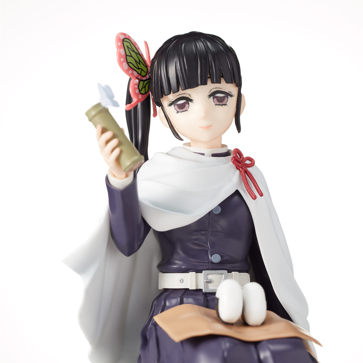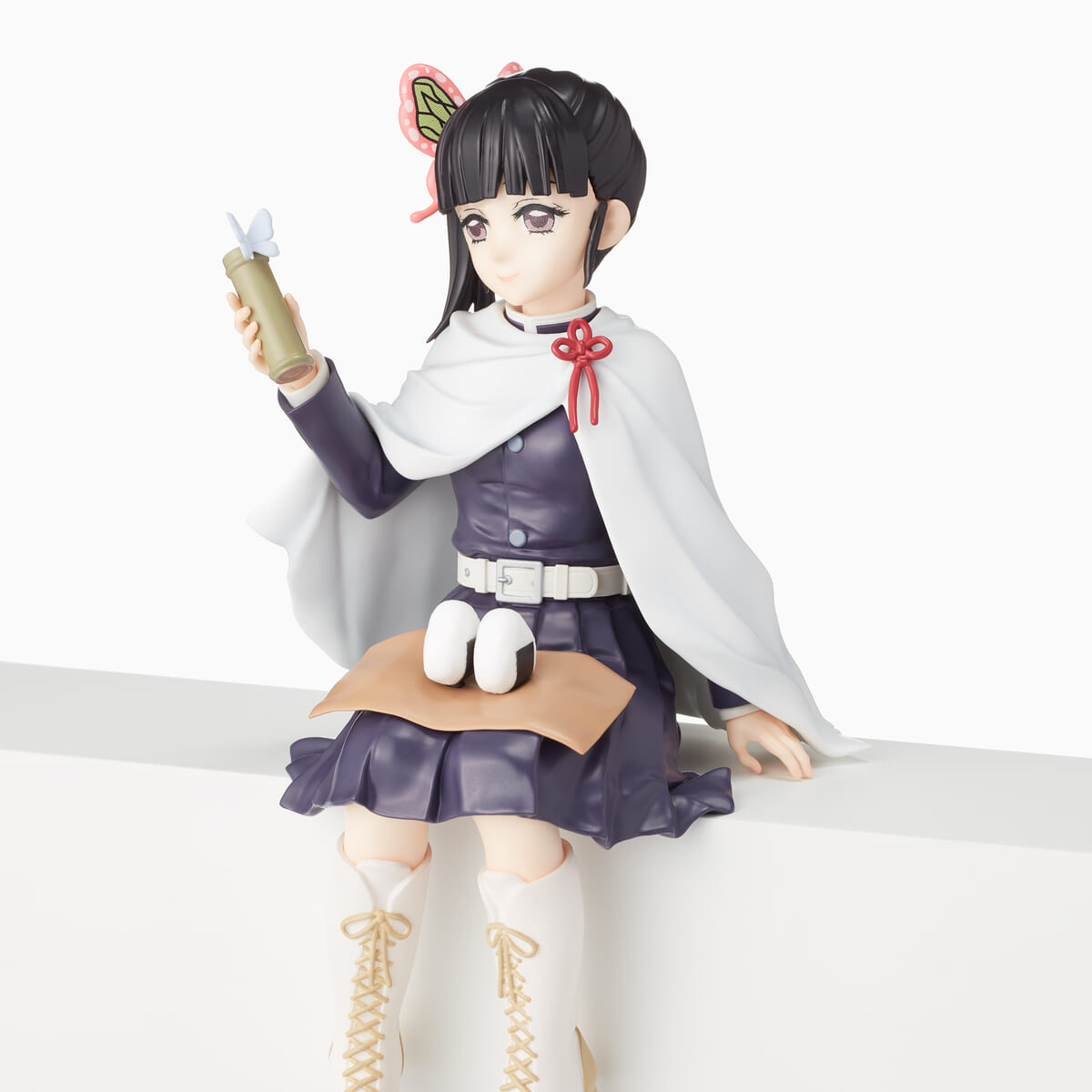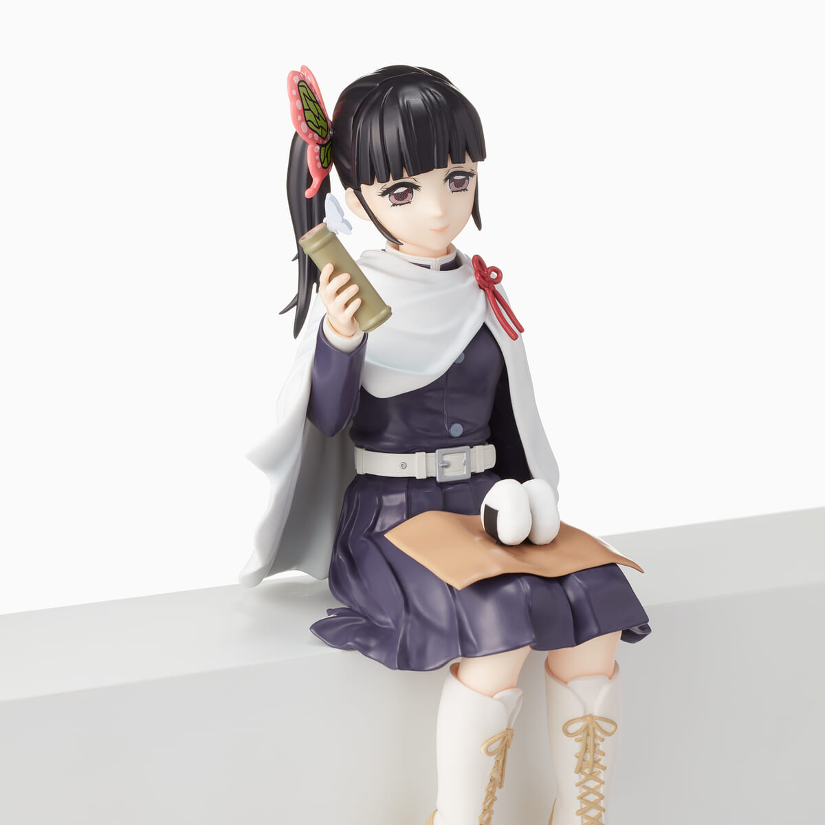 膝におにぎりを乗せ、蝶々のとまった水筒を見つめる姿が立体化されています☆