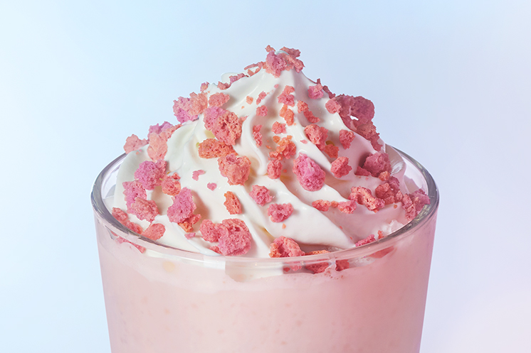 ホイップクリームの上にサクサクっと軽やかな食感とかわいらしい見た目を添える「ストロベリーフレーバーマカロン」は、桜が咲き誇るようなイメージでホイップクリームの上にトッピング。