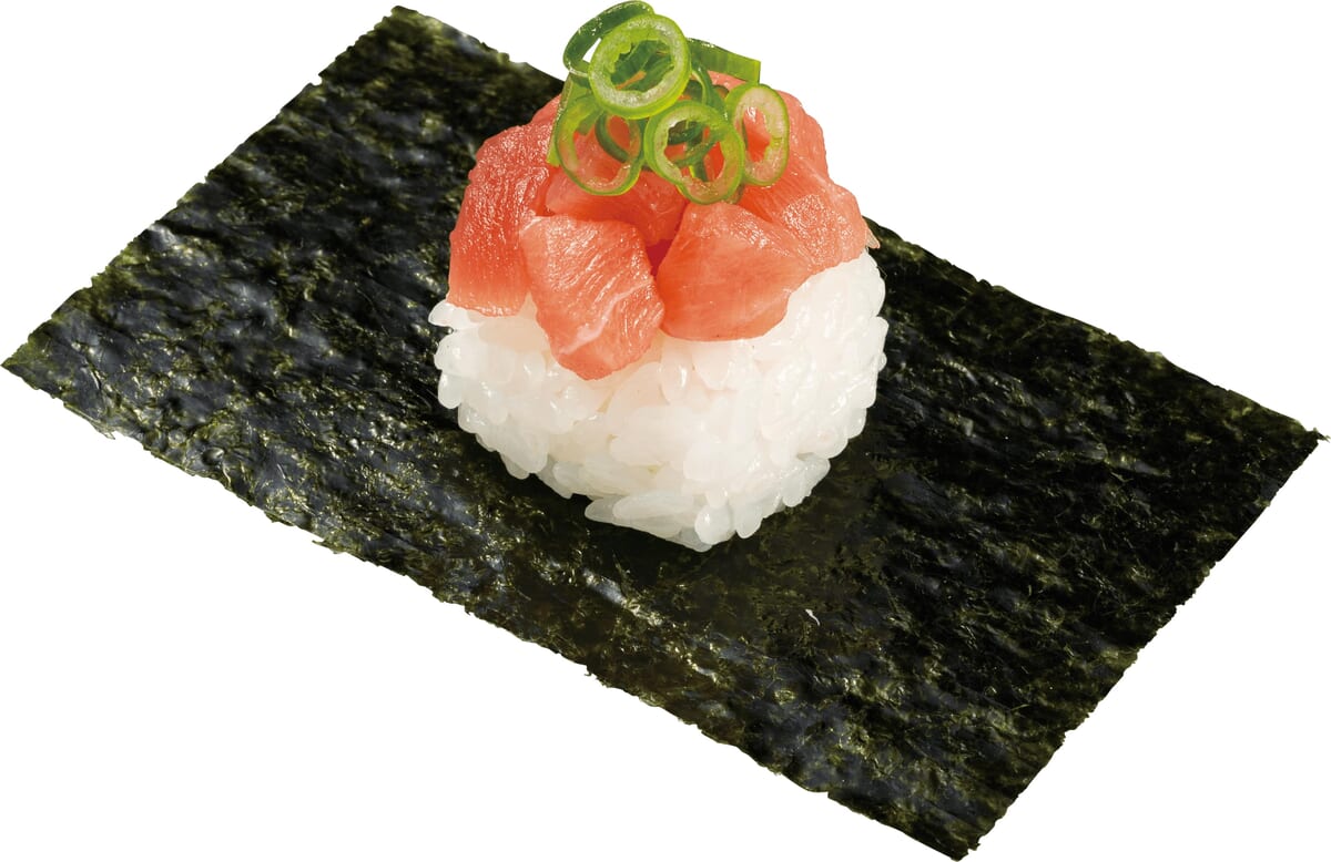 一口頬張ると、海苔の香りが広がる「天然まぐろ 中とろぶつ切り包み」