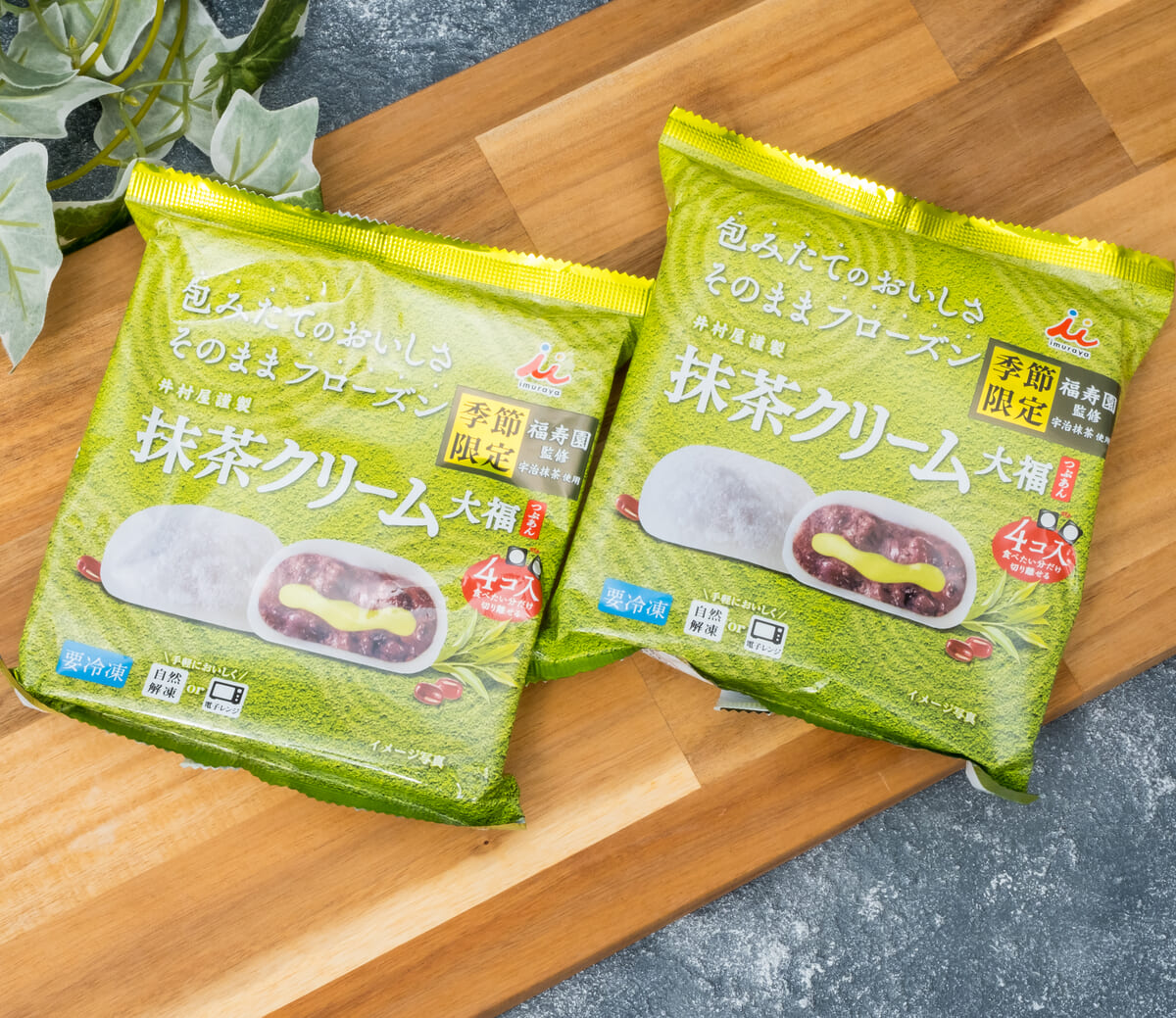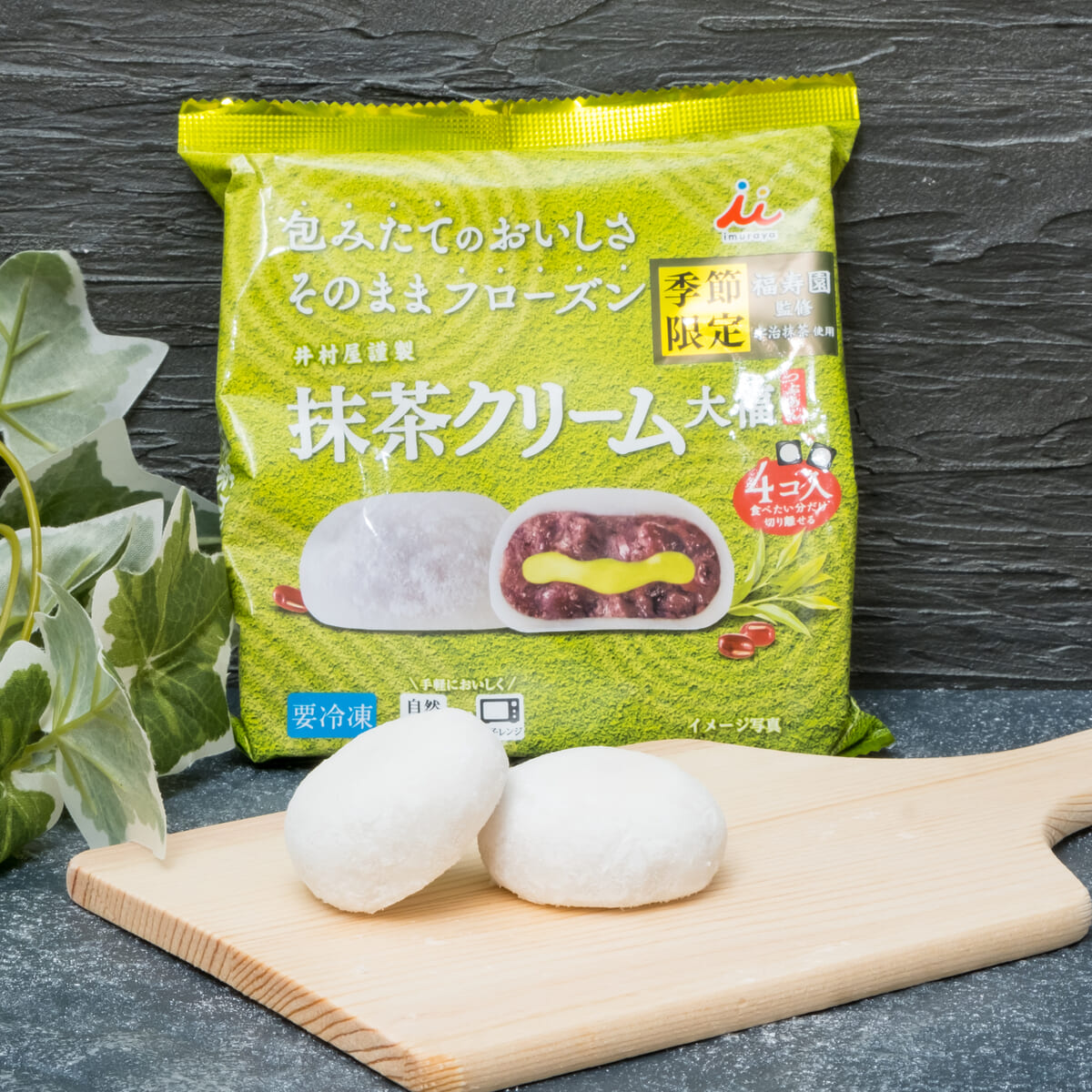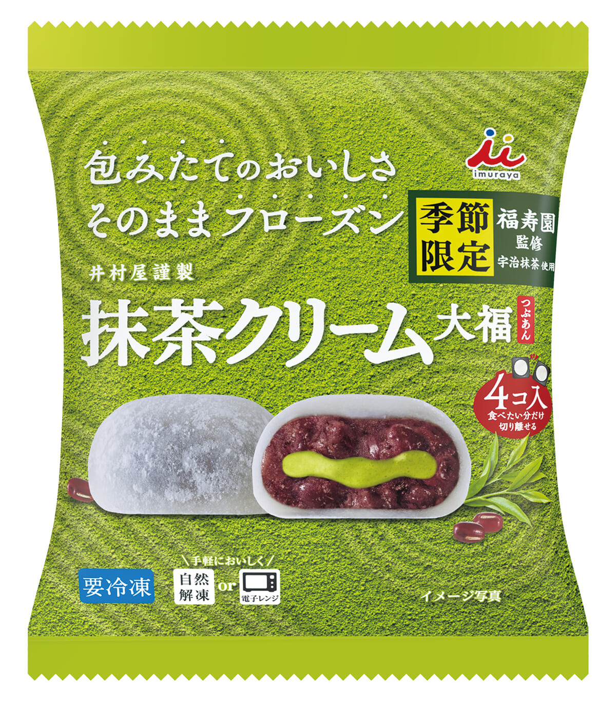 井村屋の冷凍和菓子シリーズから、「4コ入 抹茶クリーム大福(つぶあん)」が季節限定で登場!