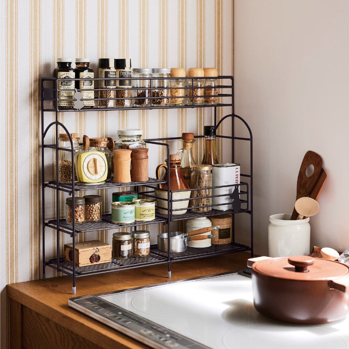 調味料やキッチングッズをまとめて並べられ、コンロ横の空きスペースを有効活用。
