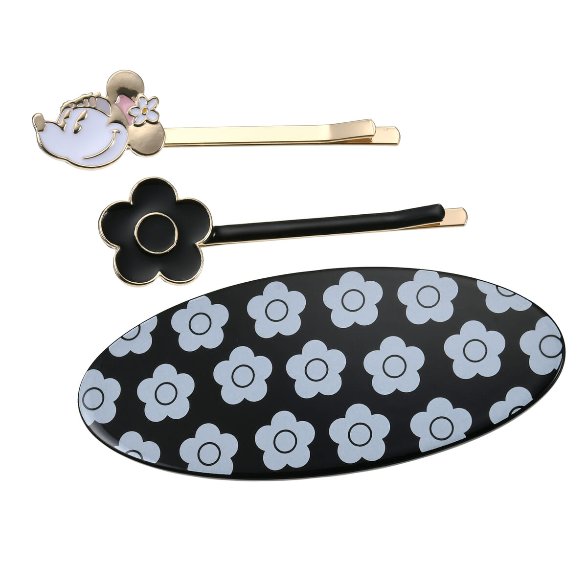 「ミニーマウス」のお顔を飾ったヘアピンと、ブランドアイコンであるデイジーモチーフをあしらったヘアピン、オーバル型のヘアクリップが揃います!