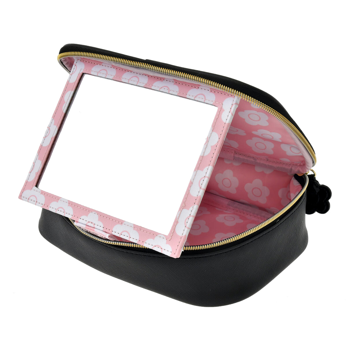 ピンク×白色のデイジーモチーフ柄が広がる内側には、天面にミラー、取り外し可能な仕切り付きの収納スペースが配されています。