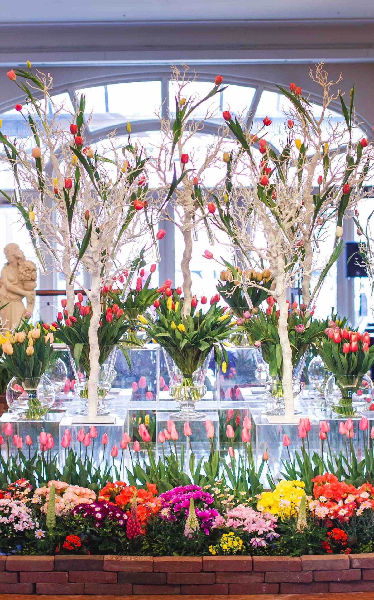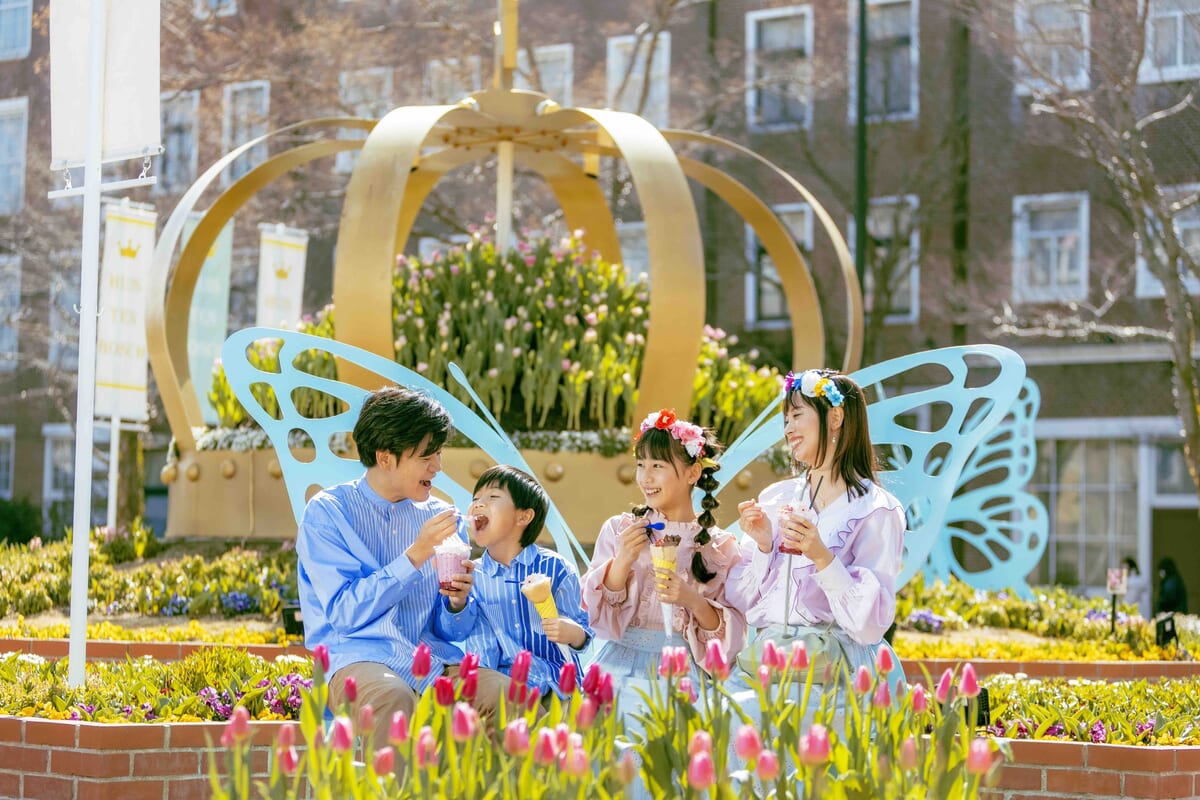 王冠のオブジェを中心に「ハウステンボス」品種のチューリップや春の花々が彩ります。