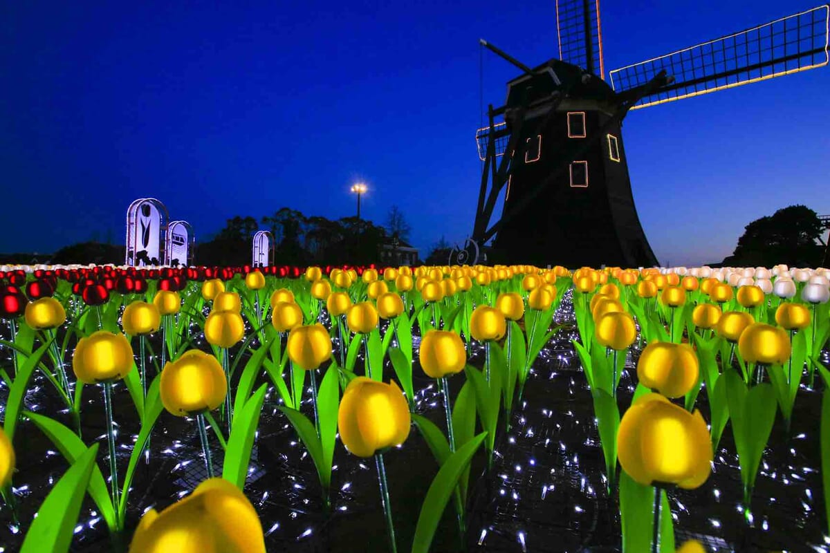 夜もきらめくイルミネーションとチューリップとのコラボレーションを楽しめます。