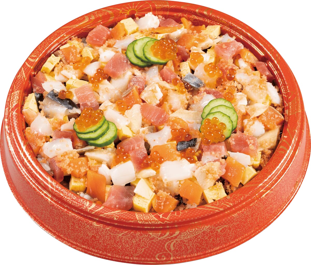長寿を意味するえびや、財宝が貯まることを意味するたまごなどの縁起の良い食材をはじめ、まぐろやサーモンなど大人からお子さんまで人気のネタを贅沢に散りばめています。
