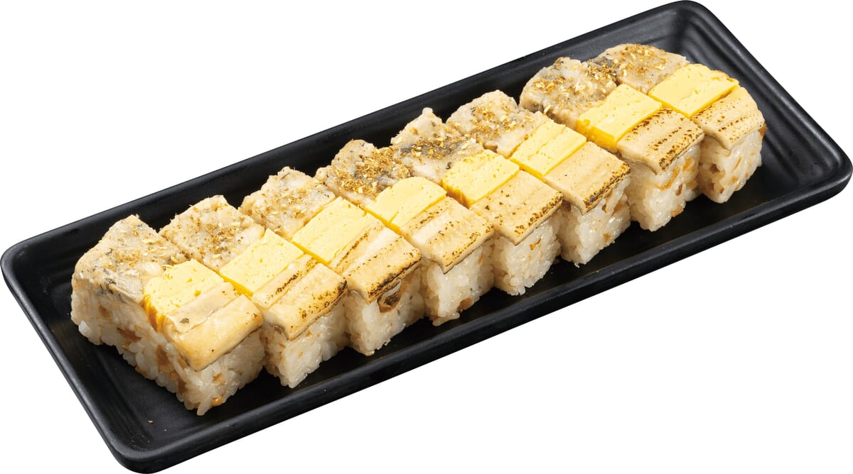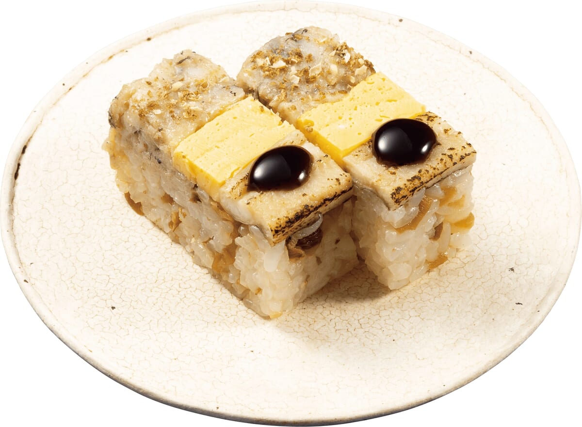 甘辛く炊いたしいたけ・干ぴょう・胡麻を混ぜ合わせたシャリの上に、ほぐした上煮穴子としっかり炙り香ばしさをまとった上煮穴子、優しい甘さの玉子焼きを並べてのせた押し寿司。
