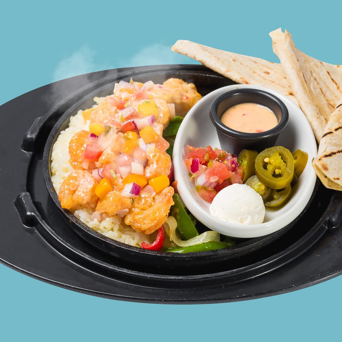 特製のブンブンソースで和え、アツアツの鉄板にバターライス、ペッパーオニオンと盛り付け、マンゴーピコデガヨで甘酸っぱい南国テイストに仕上げられています。