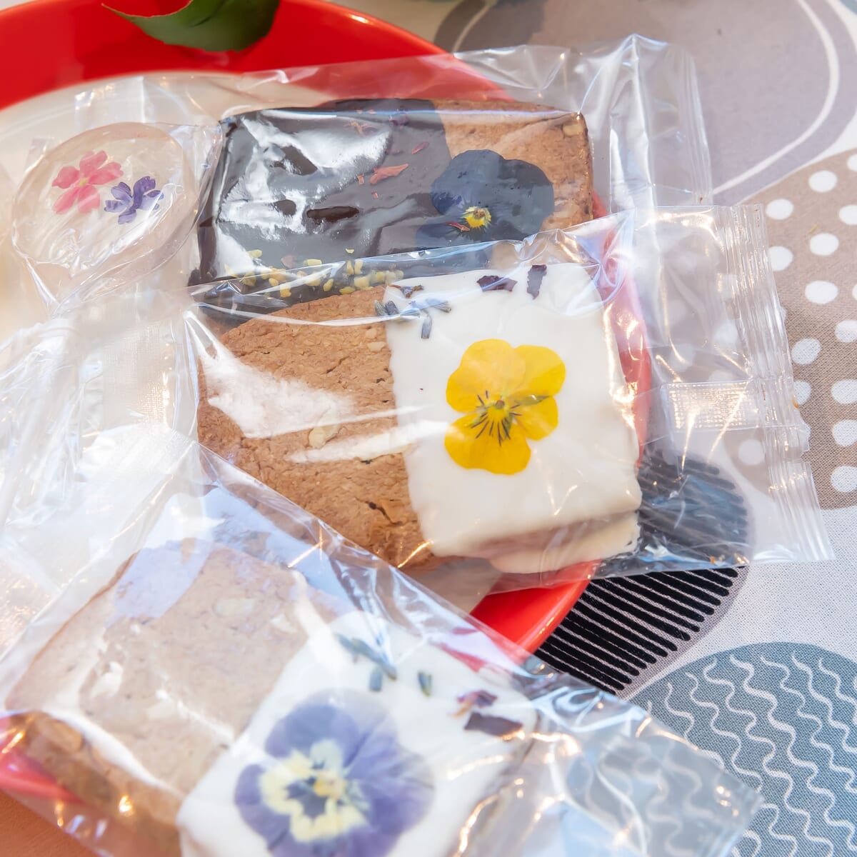 食用のお花「エディブルフラワー」を使用したクッキーと、