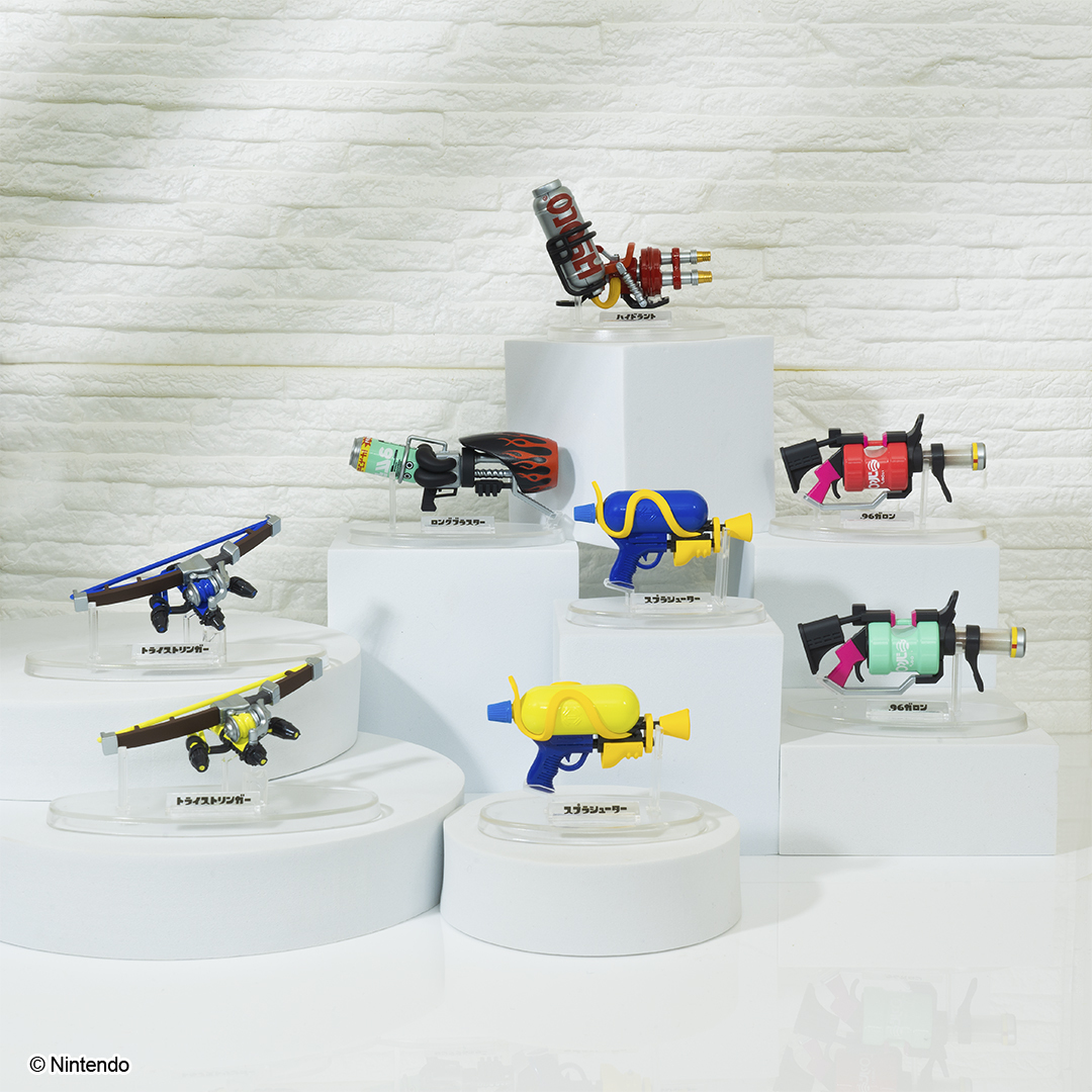 ラインナップは「トライストリンガー(イエロー)」「トライストリンガー(ブルー)」「スプラシューター(イエロー)」「スプラシューター(ブルー)」「.96ガロン(ライトブルー)」「.96ガロン(レッド)」「ハイドラント」「ロングブラスター」の全8種類です。