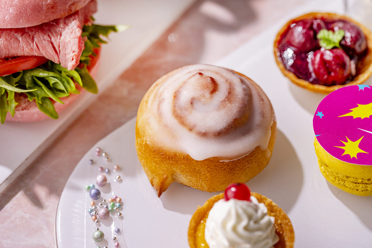 スイーツの合間に楽しめるセイボリーには、春らしいピンク色のバンズで挟んだミニローストビーフスライダーや、春野菜のムースを忍ばせたブリュレなども用意されます。