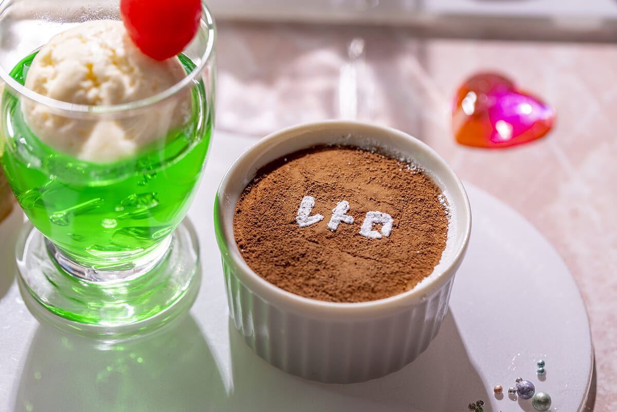 フォトジェニックな見た目とともに時代を超えた定番のドリンクであるクリームソーダは、トップにマラスキーノ・チェリーを添えてソーダの部分はジュレで再現したスイーツに。