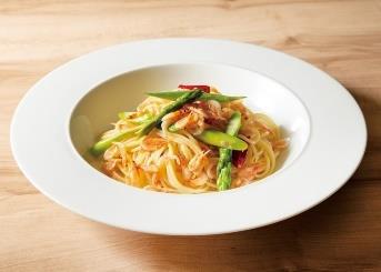 アスパラガスのシャキシャキ感と、桜えびの香ばしさが楽しめるスパゲティ。