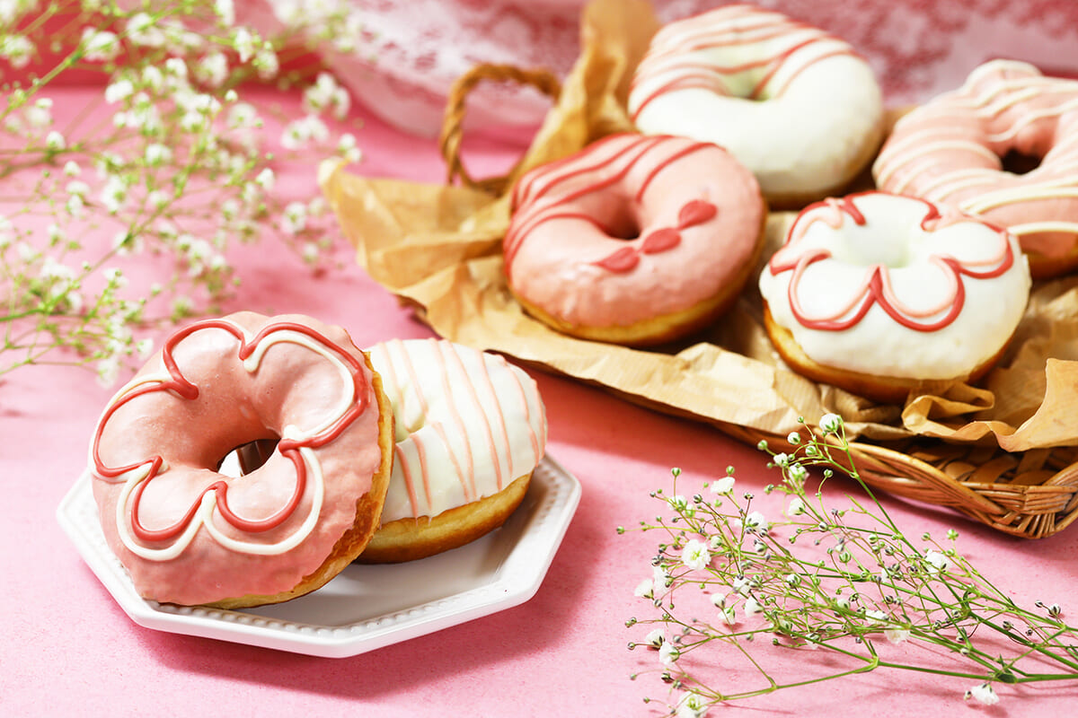いちごチョコや桜の塩漬けを、春らしく華やかにトッピングしたドーナツ。
