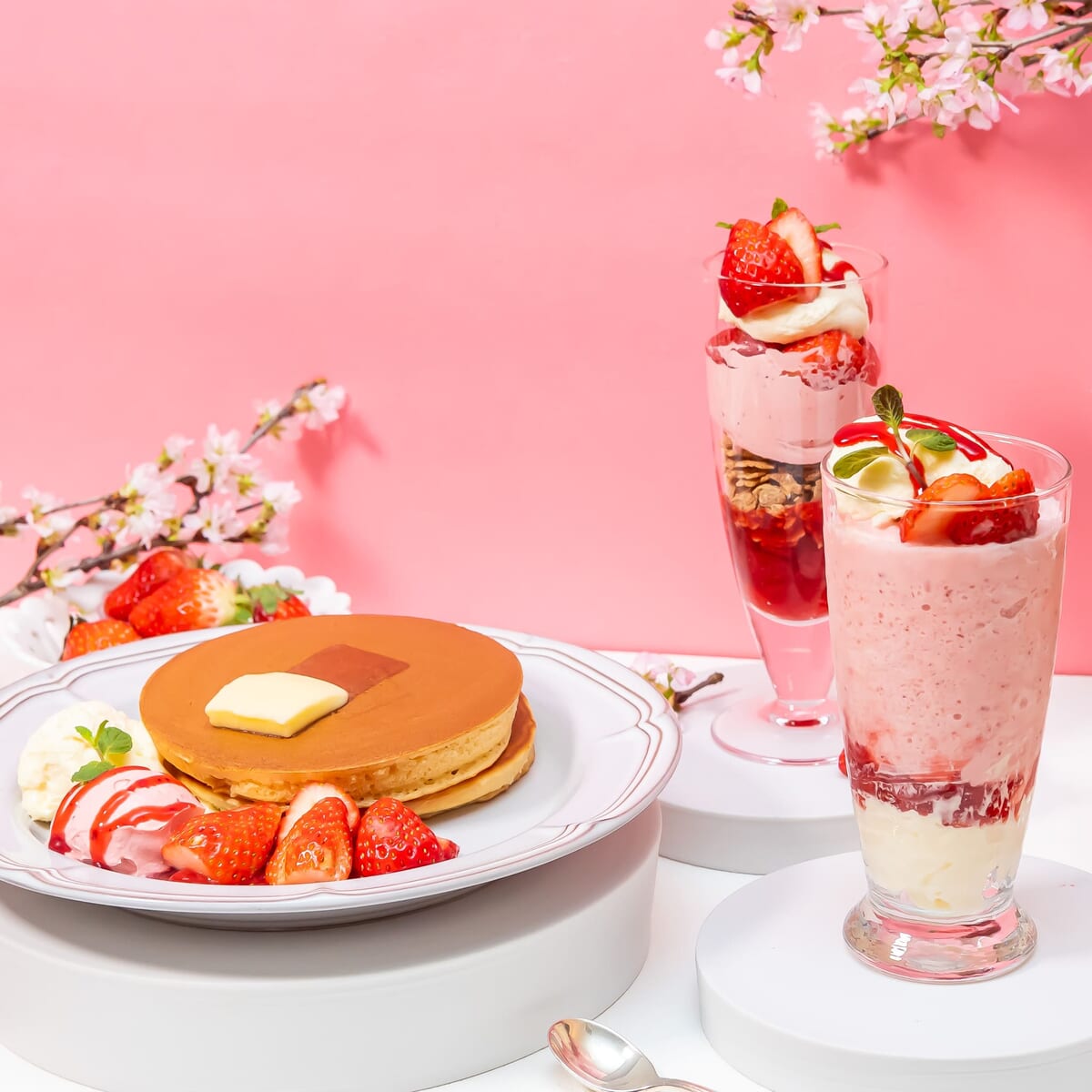 フレッシュないちごと、くちどけ柔らかなムースやホイップなどふんわり食感が楽しめる、フローズンドリンク、パフェ、ホットケーキの3種が期間限定で提供されます。
