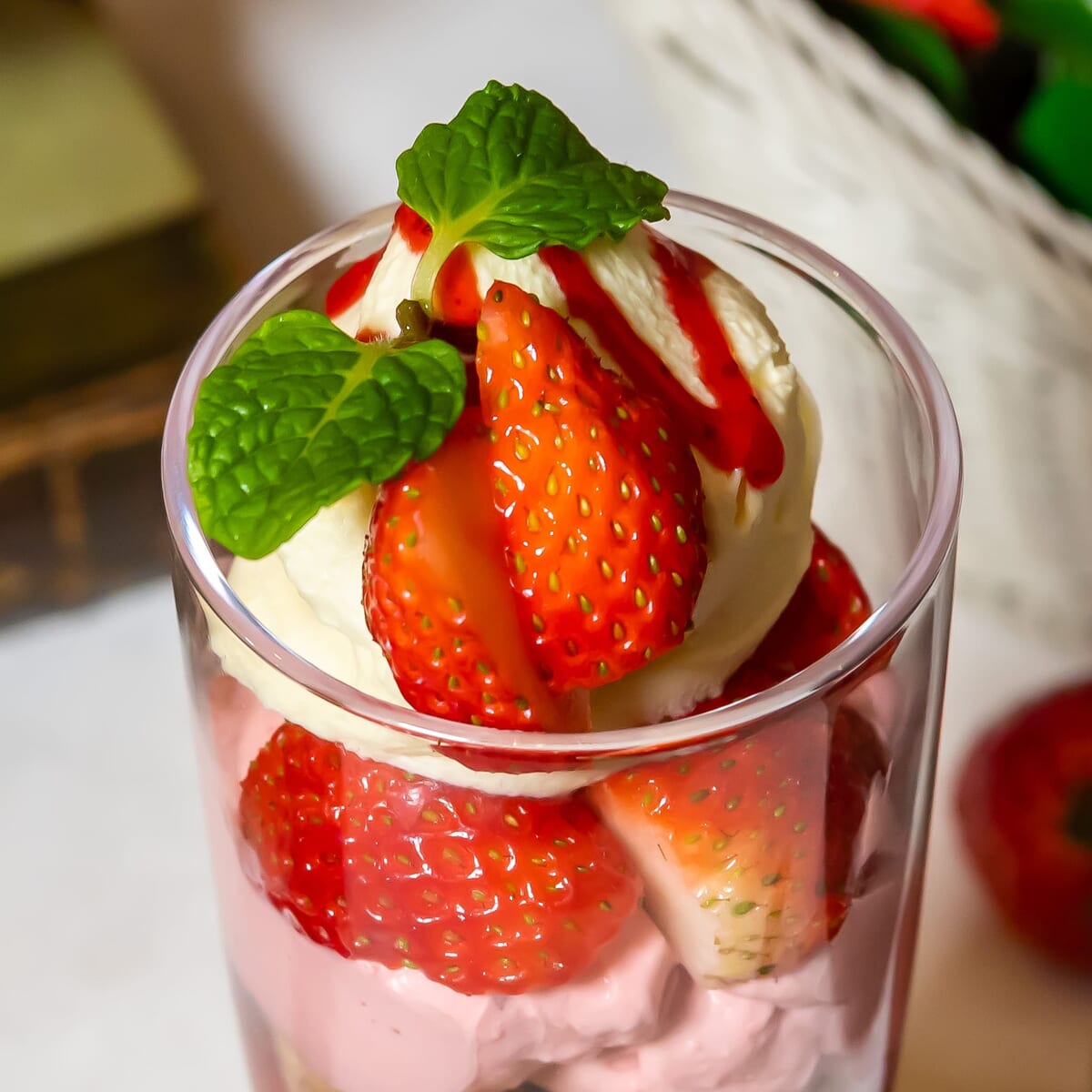 グラスの底とトッピングにふんわりムースと果肉感ある甘酸っぱいストロベリーソースが合わせられています。