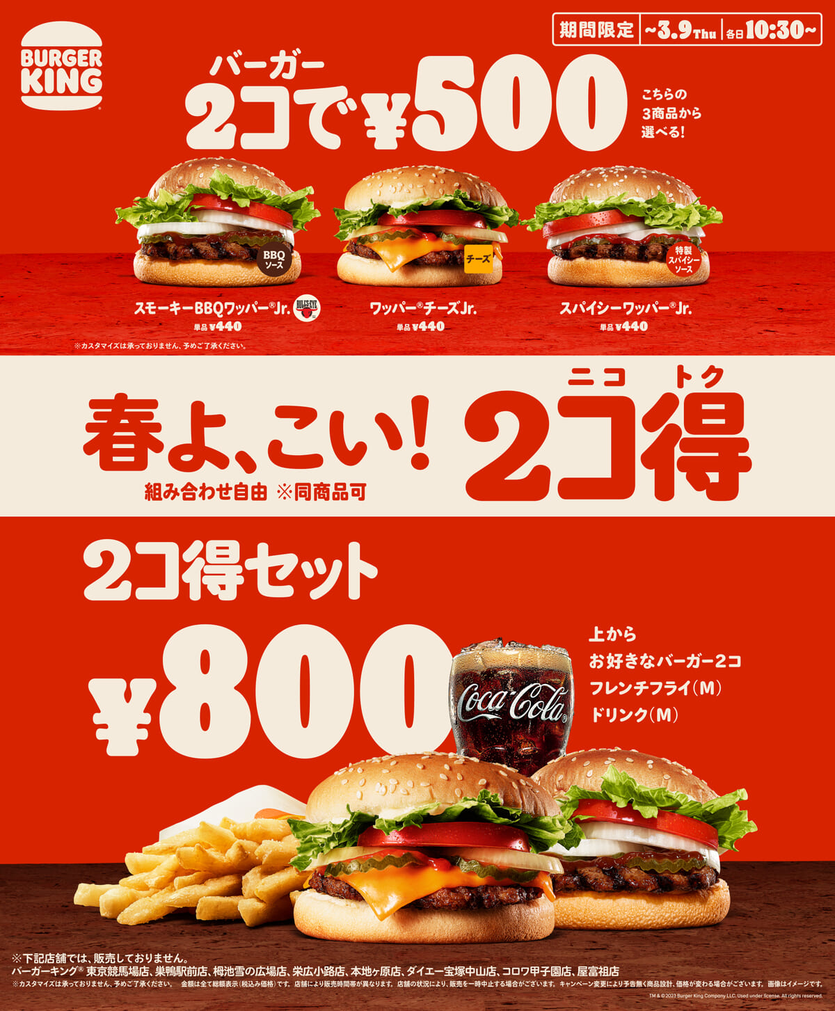 バーガーキング「2コ得(ニコトク)」「2コ得(ニコトク)セット」