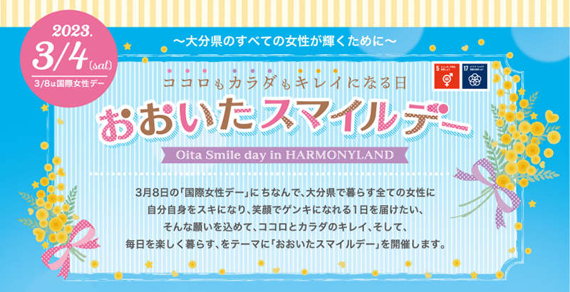 「ココロもカラダもキレイになる日 おおいたスマイルデー」は、2023年3月4日(土)にハーモニーランドのフェスティバルステージにて開催です。