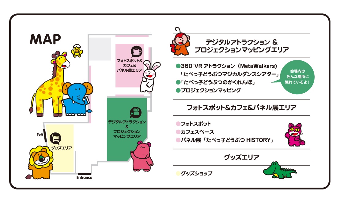 過去最多となる56種のどうぶつがグッズ化されるほか、大人気コンセプトカフェや最新デジタルアトラクションで「たべっ子どうぶつ」の世界観が楽しみ尽くせるイベントです!
