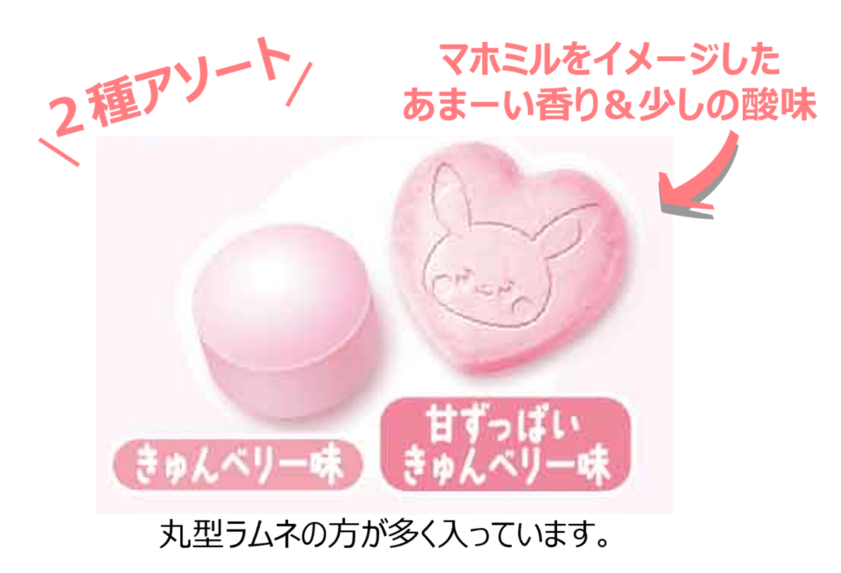 ラムネは「きゅんベリー味」と「甘酸っぱいきゅんベリー味」の2種アソートです。