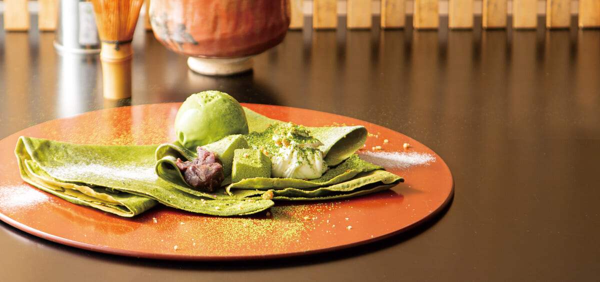 桃の花を連想させる気品ある優しい香りが自慢の自家製クレープ生地に抹茶を練り込んだ、香り豊かで色鮮やかな仕上がりに。