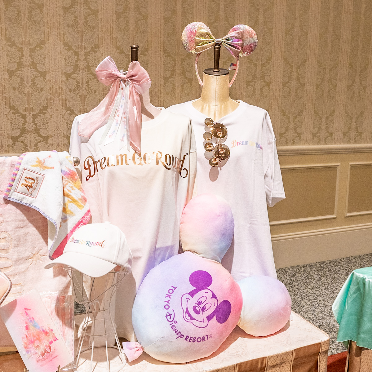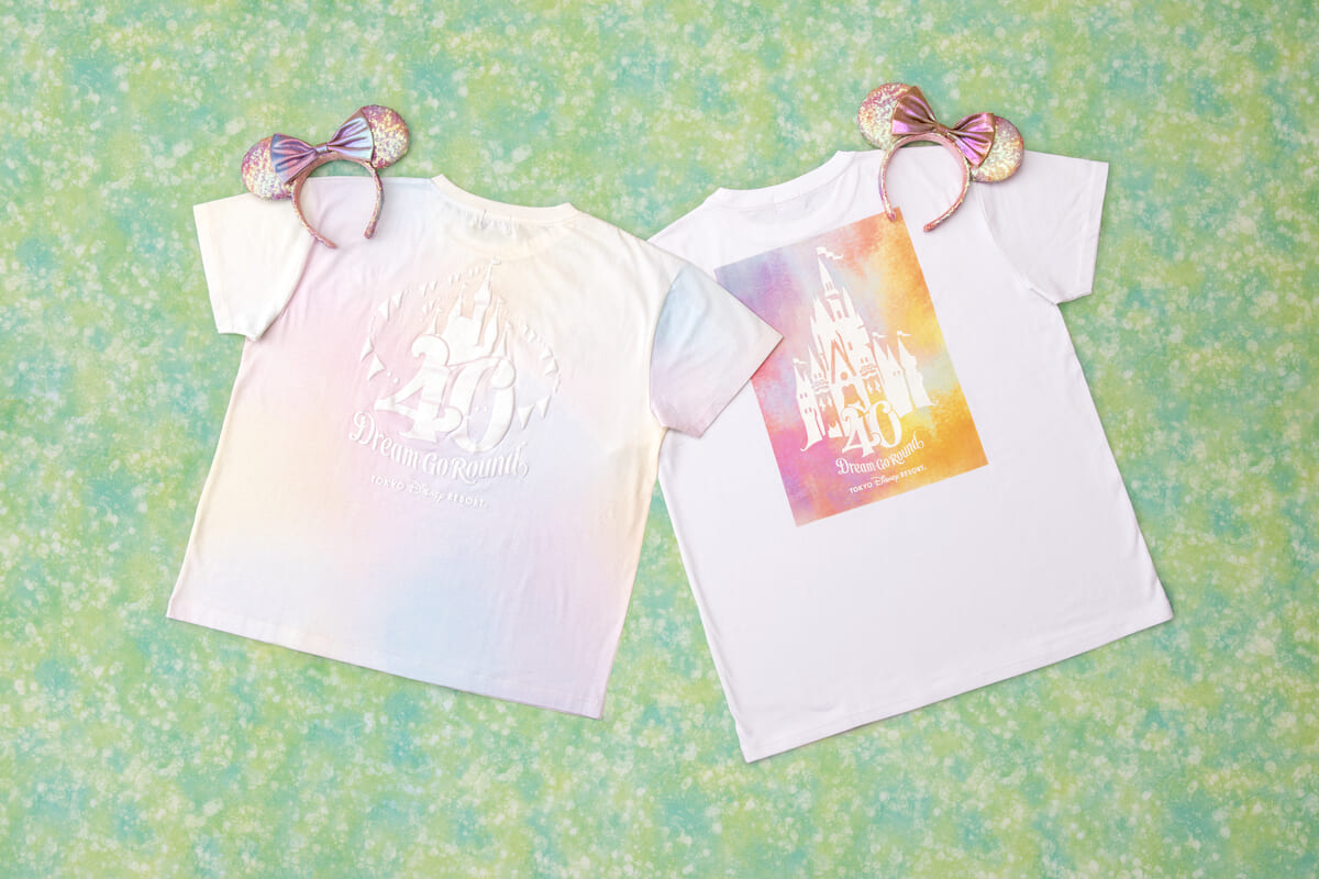 期間中、40周年カラーのロゴやシンデレラ城がデザインされたTシャツ、スパンコール素材のカチューシャなどカラフルで お祝い感あふれるグッズを販売。