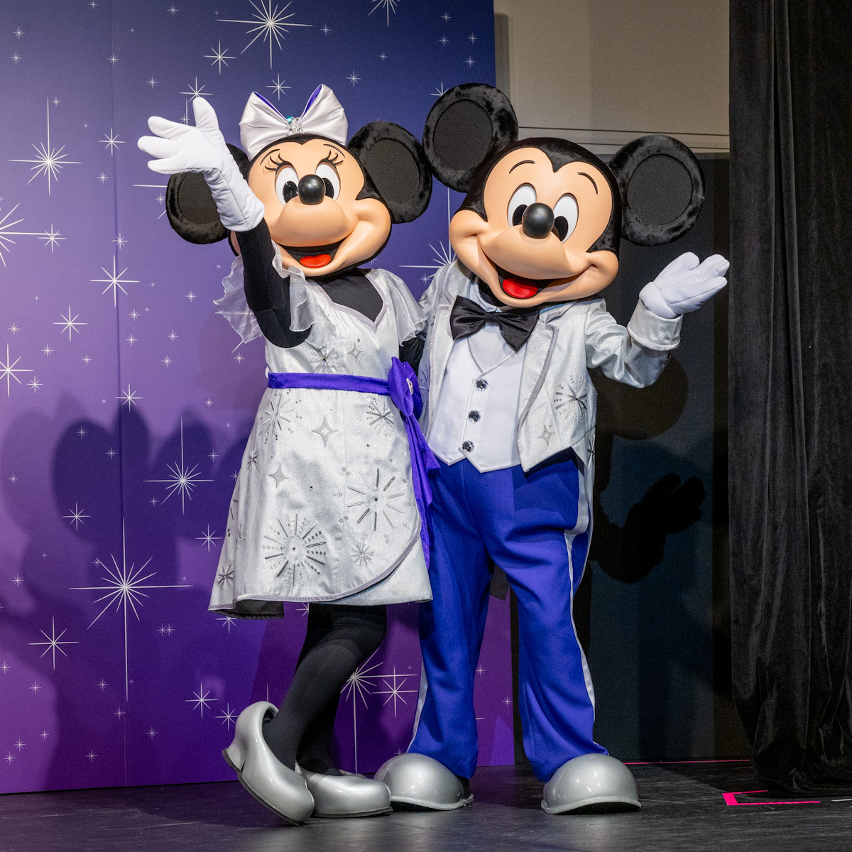 ウォルト・ディズニー・カンパニー創⽴100周年を記念した新しい⾐装を⾝にまとったミッキーマウスとミニーマウス。