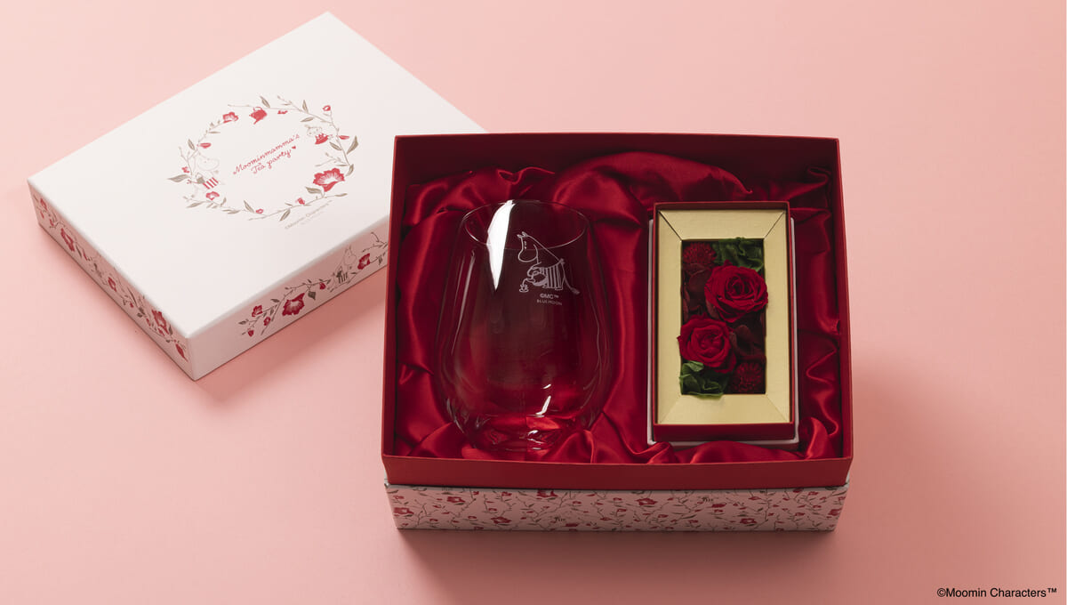 「ムーミンママ」がおしゃれにデザインされたグラスと赤いお花のセット。