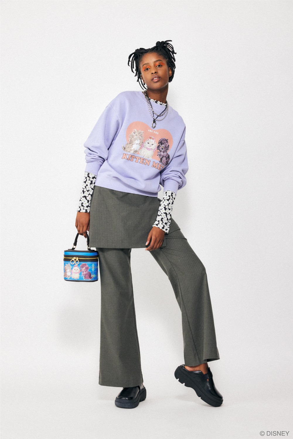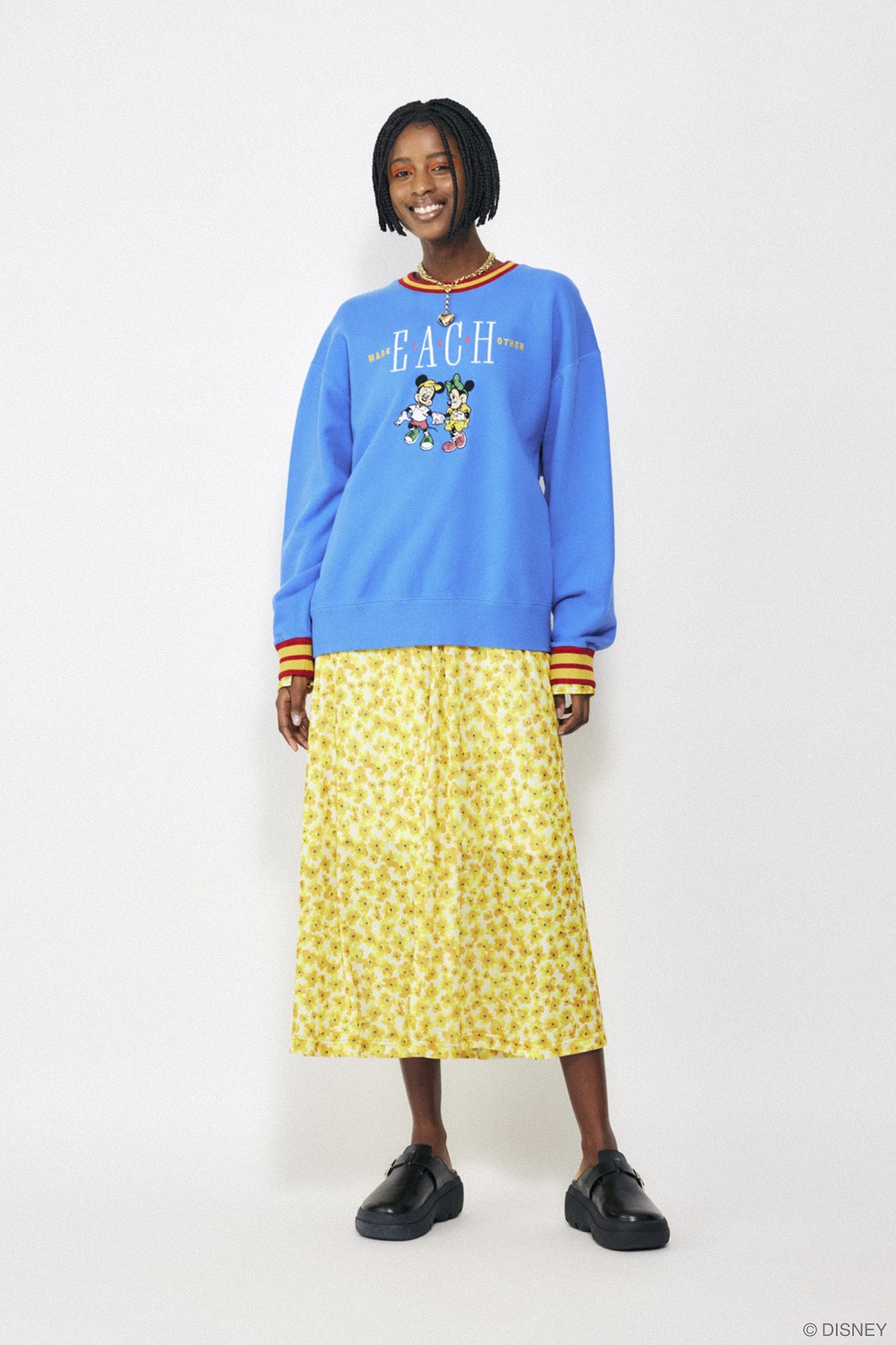 ネックケースには「ミッキーマウス」のお顔をあしらったポーチがセットになっており、セットアップで着られるブラウスとスカートは、キラリと輝く箔プリントの「ミッキーマウス」も隠れています☆