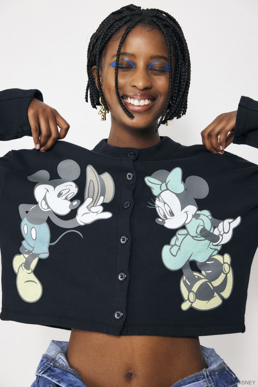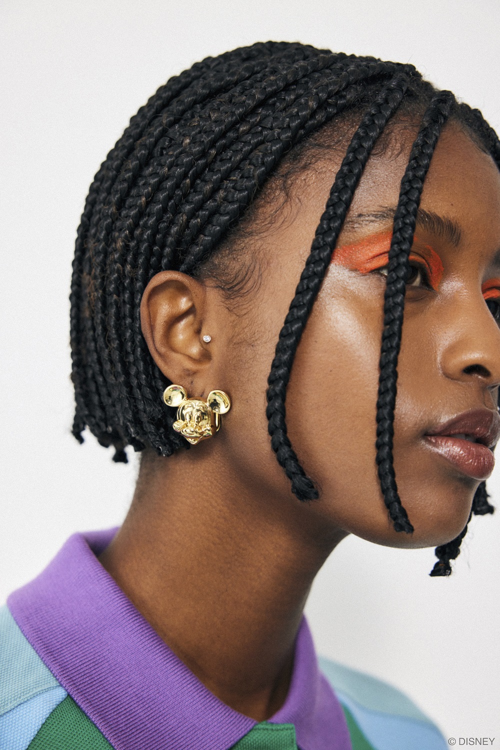大ぶりなピアスは「ミッキーマウス」のフェイスデザインで、耳元をポップに演出。