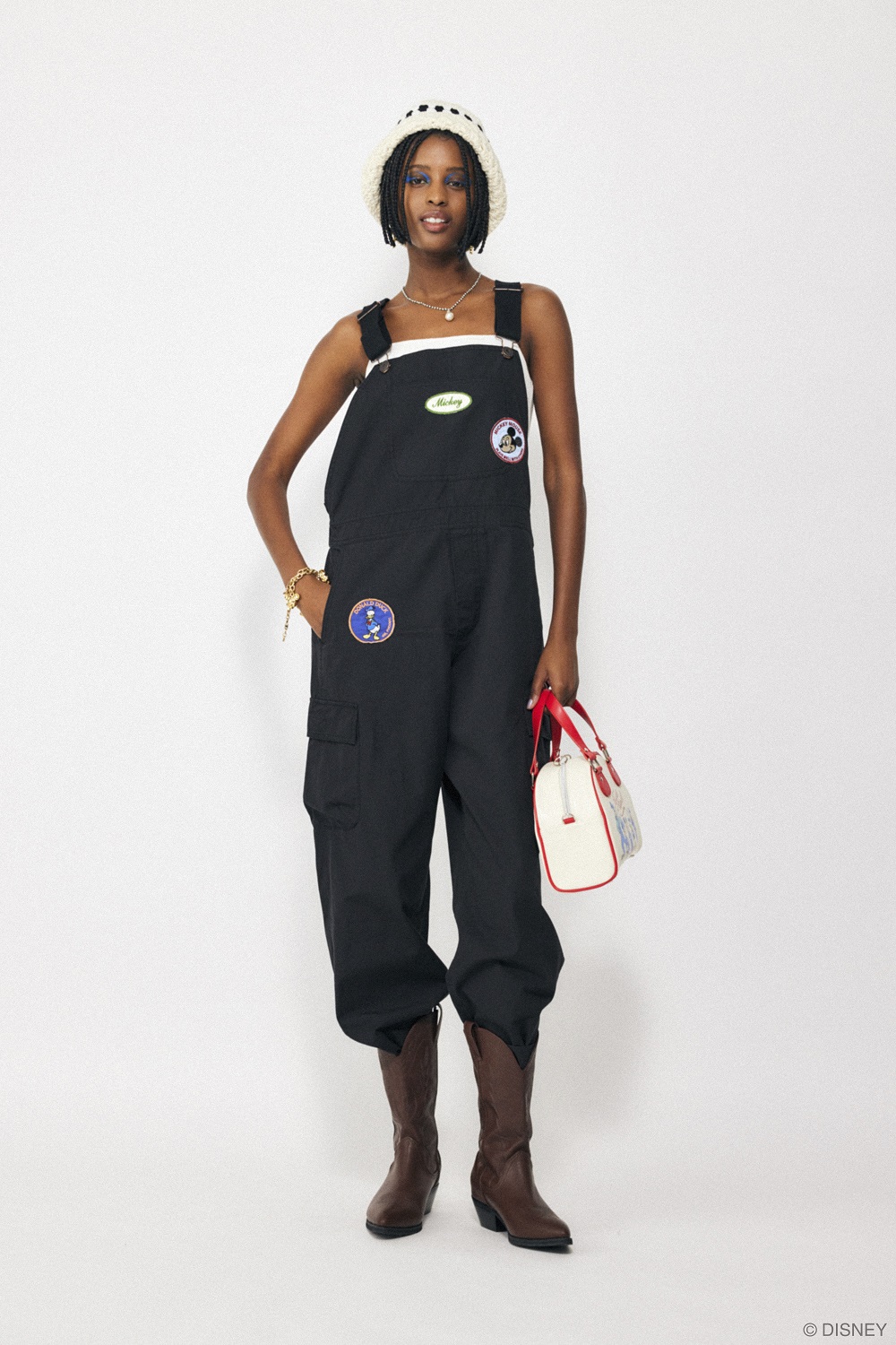 レトロ感あるワッペンをあしらったオーバーオールや